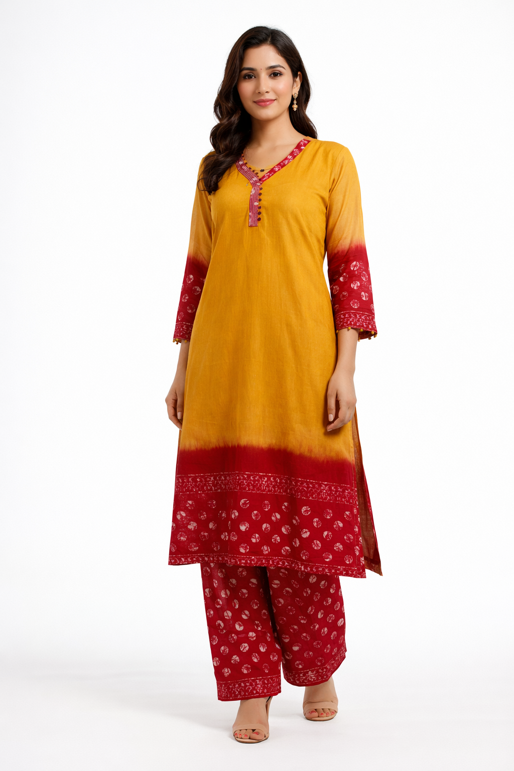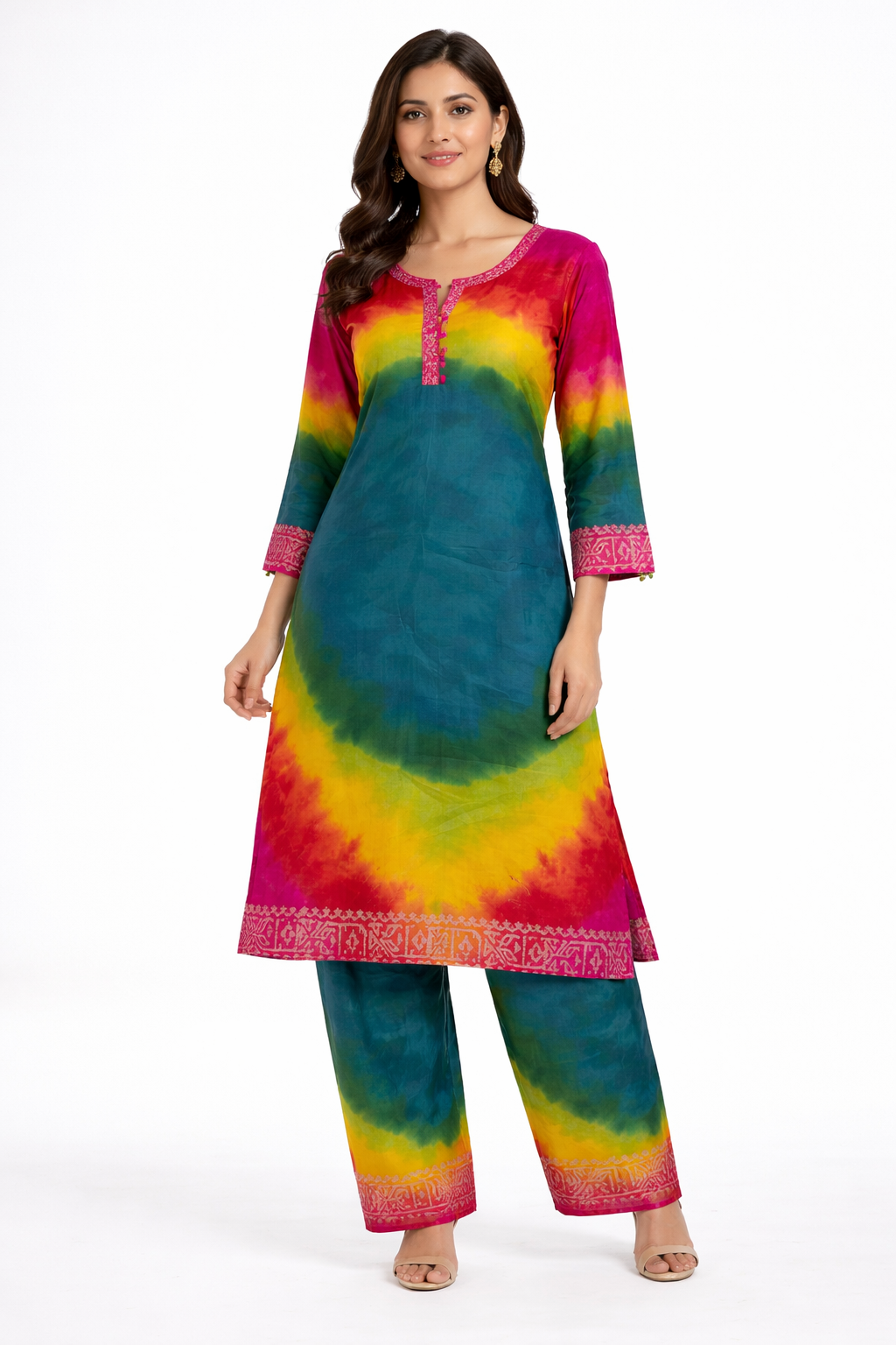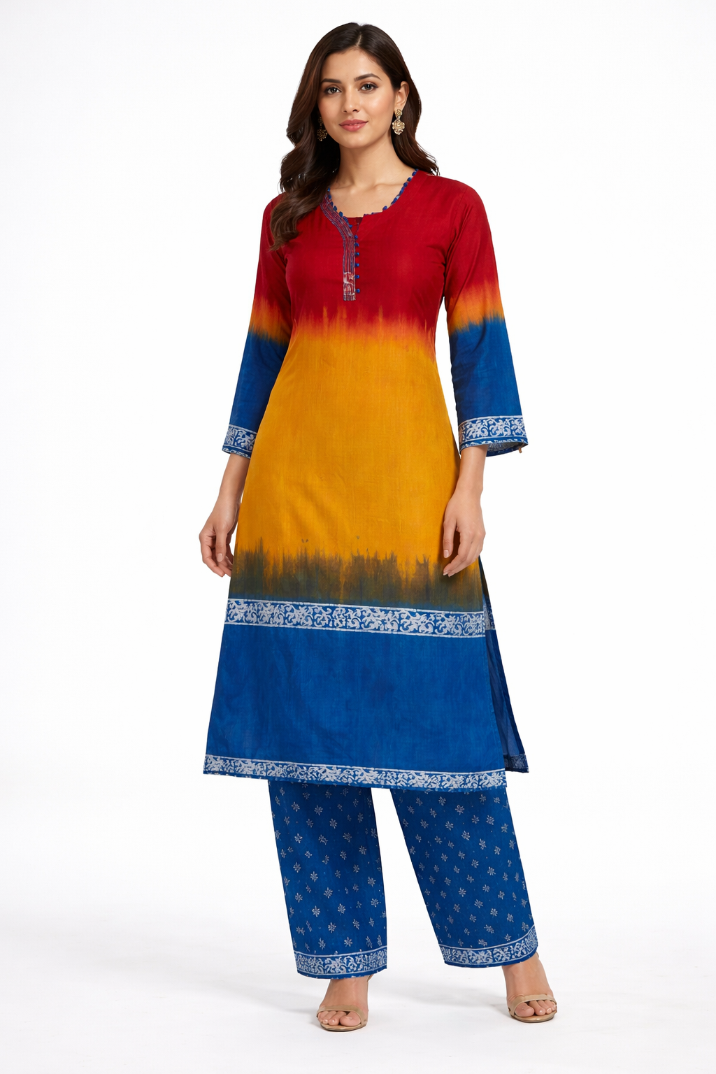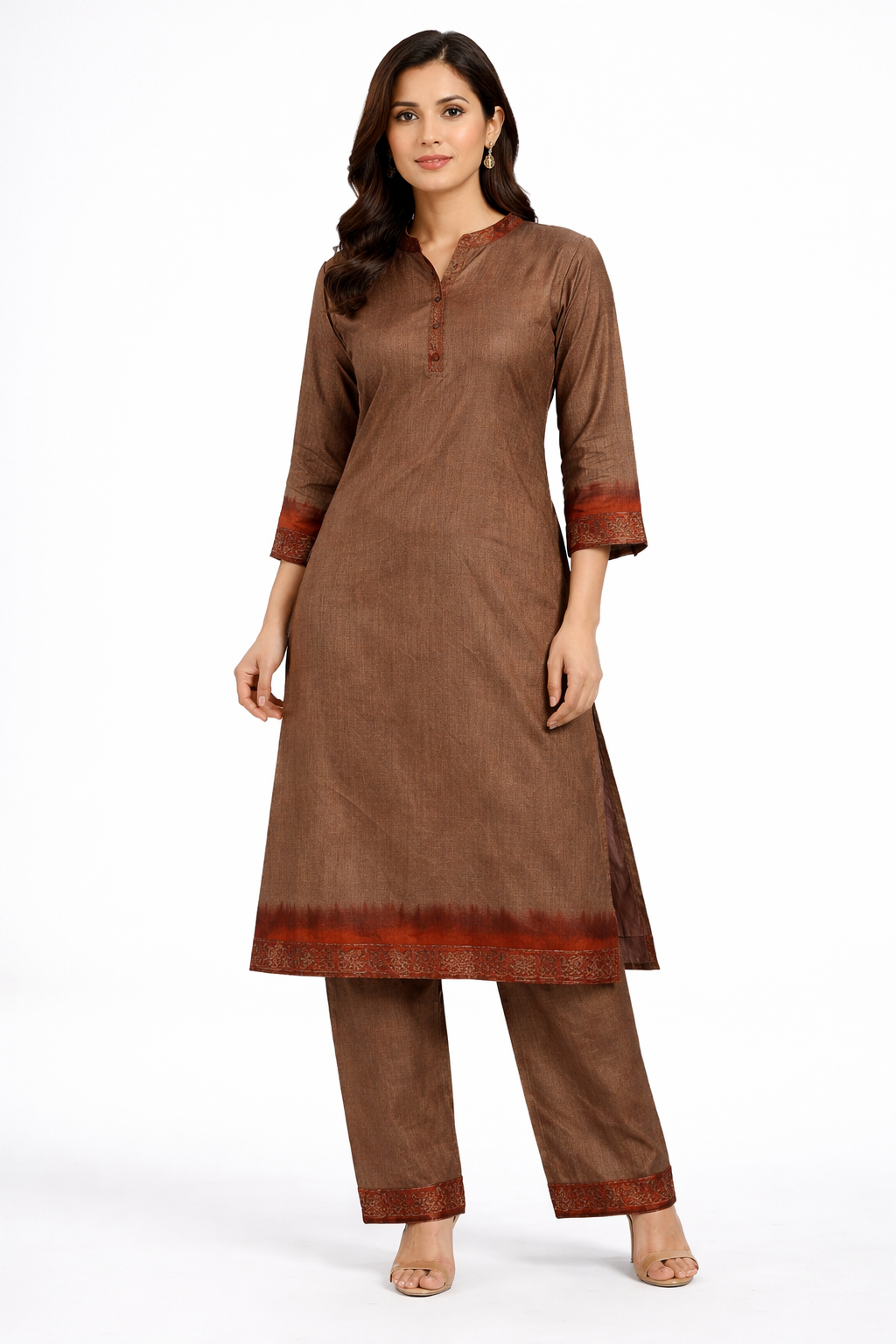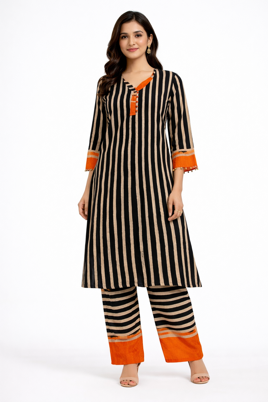 Elegant black kurti set featuring vertical beige stripes and vibrant orange detailing on the neckline, sleeves, and pants. Designed with a comfortable straight fit and paired with matching striped trousers, this outfit blends modern style with everyday comfort—perfect for casual wear or semi-formal occasions.