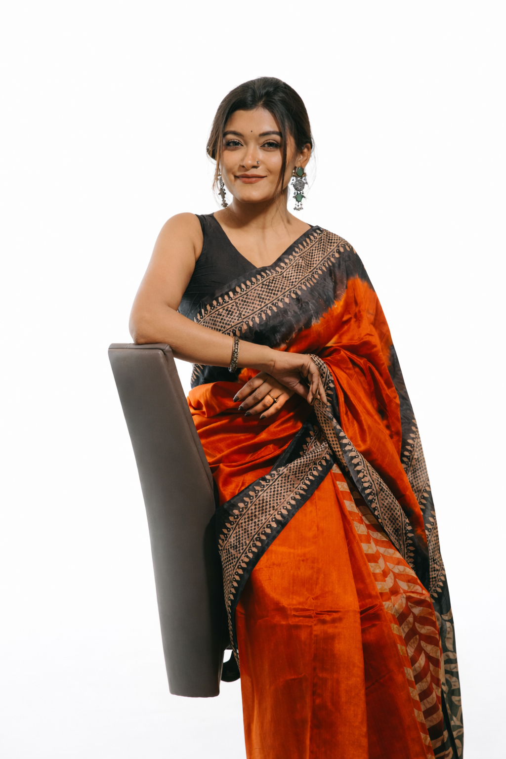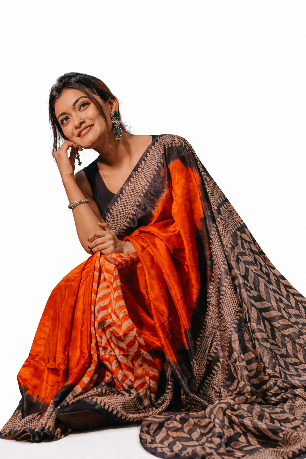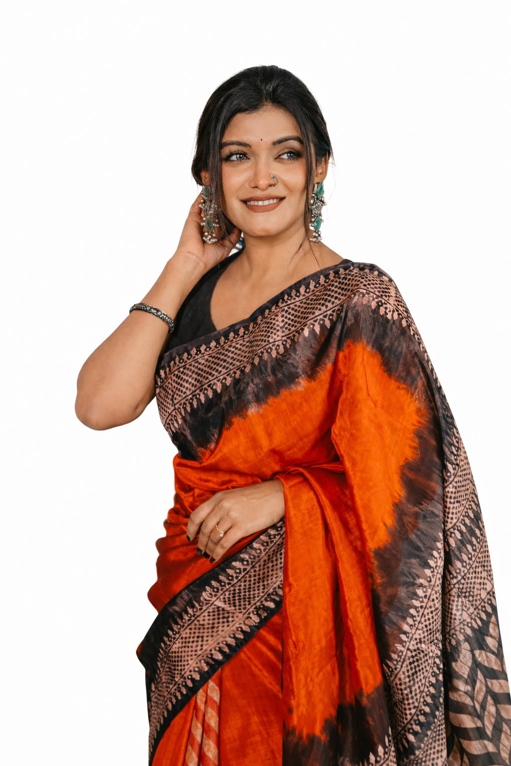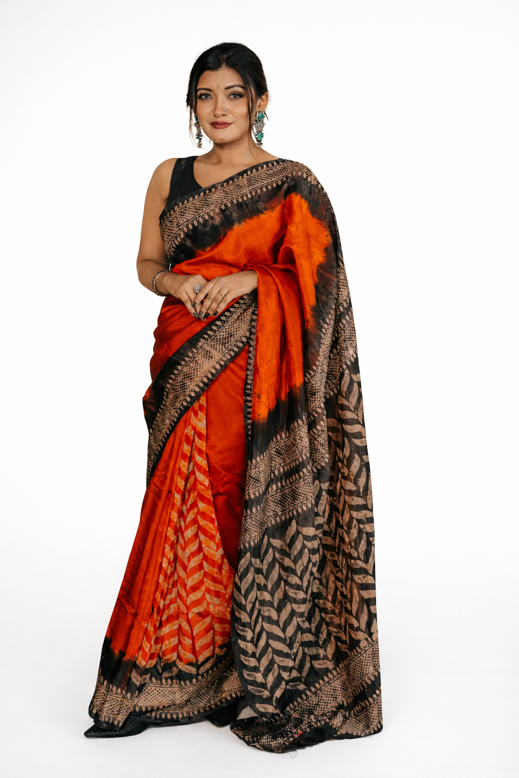 Step into timeless elegance with this stunning black and fiery red saree, designed to make a bold yet graceful statement. The vibrant red body is beautifully contrasted with a rich black pallu and intricately detailed artistic prints, giving it a modern ethnic appeal.